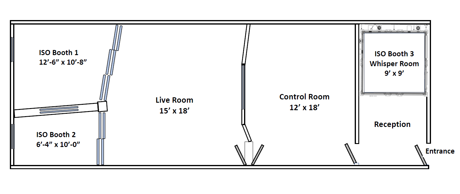Our Live room can accommodate up to 8 musicians and includes an isolation booth that can house up to 2 musicians and a 9’ x 8’ Whisper Room that fits a drum set or up to 2 musicians. The room includes a Yamaha C3 grand piano.